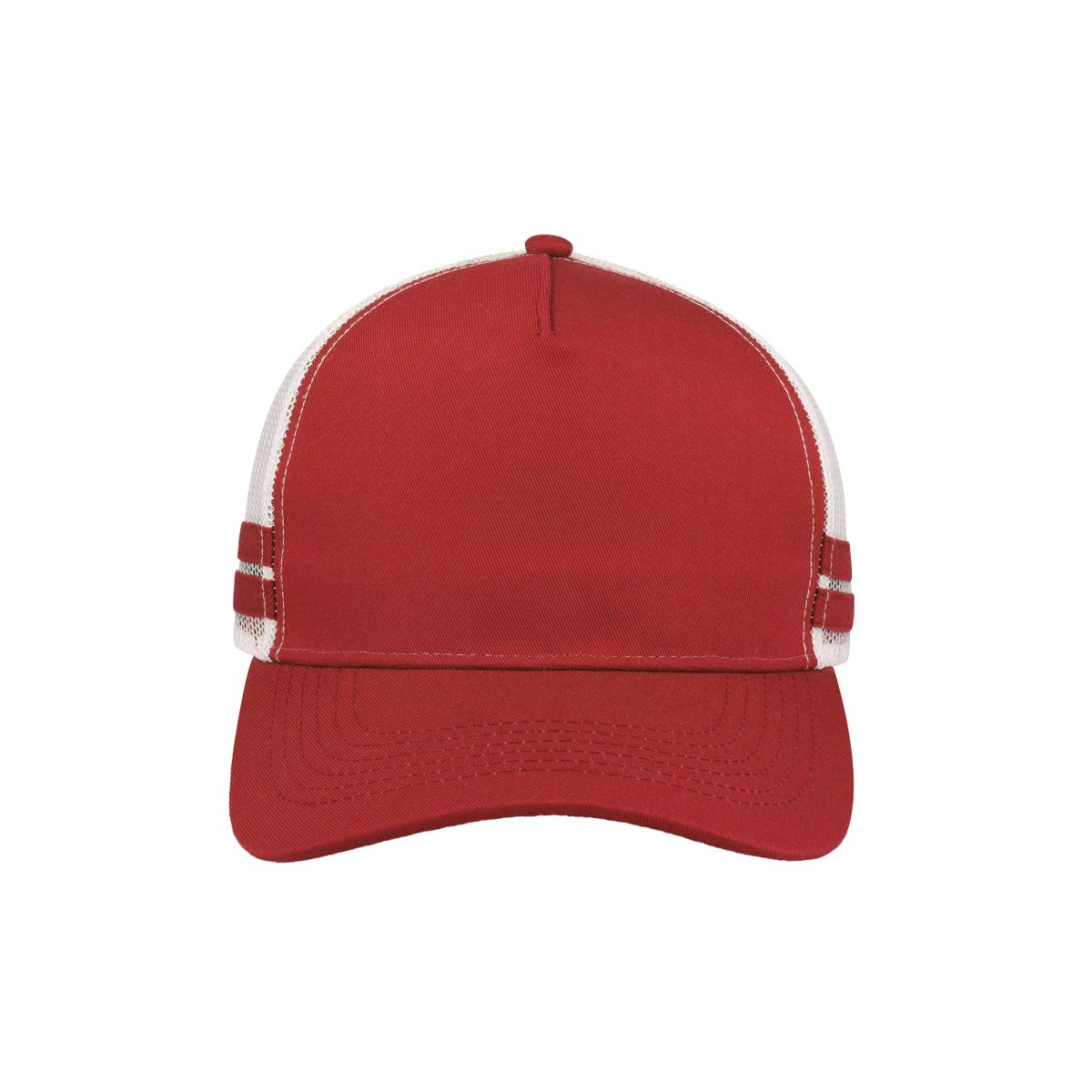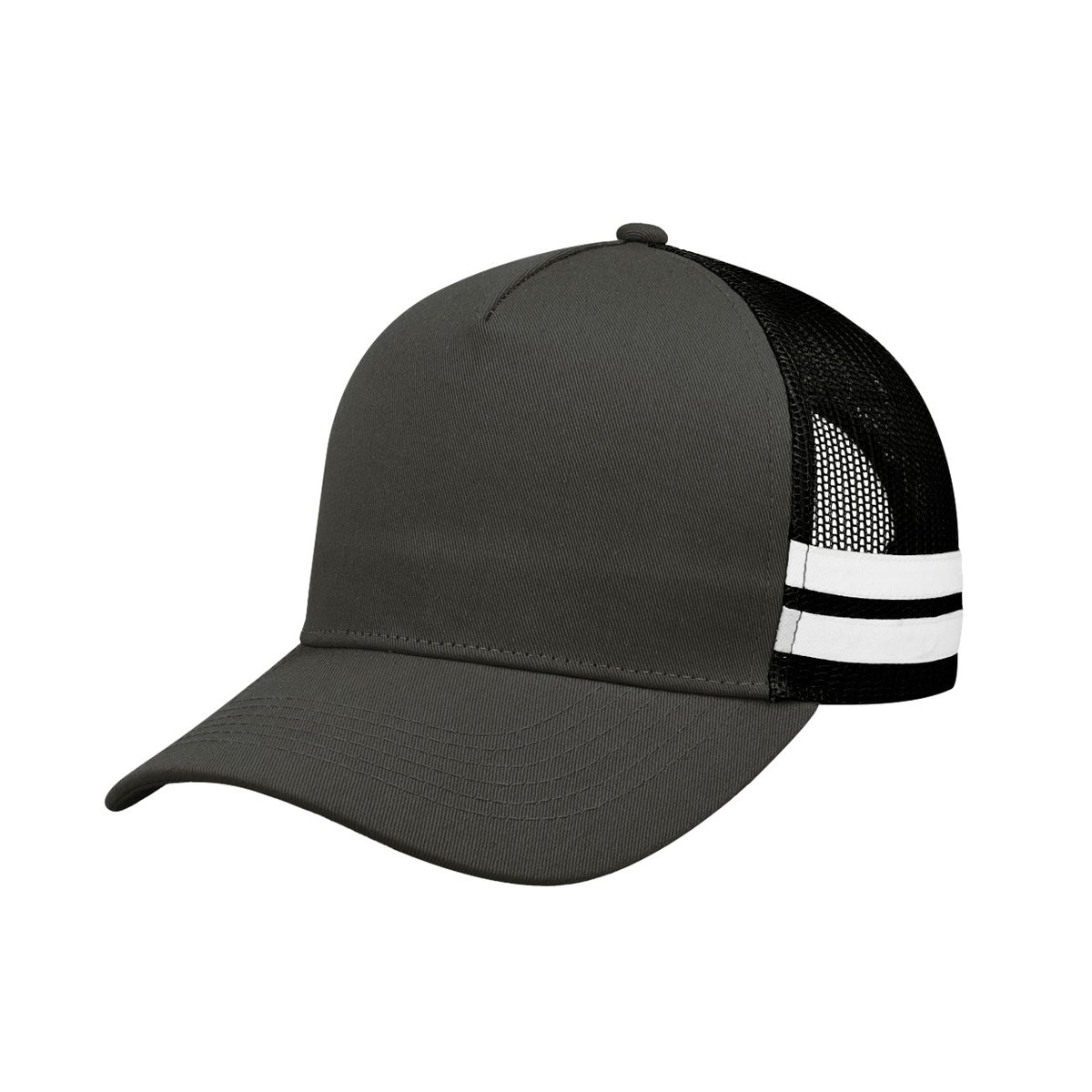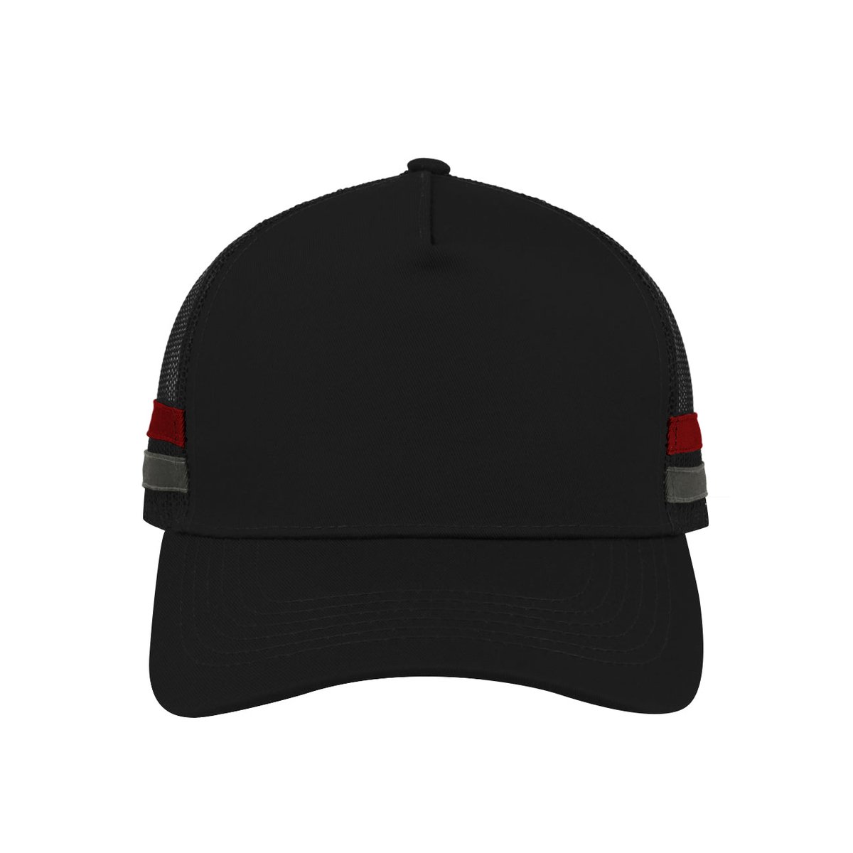 Increase brand visibility with this practical Striped Trucker Cap. It features a classic five-panel design with a charcoal grey and red striped front, plus a breathable mesh back. An adjustable snapback closure fits most adults. This cap makes a distinct promotional item for your brand.