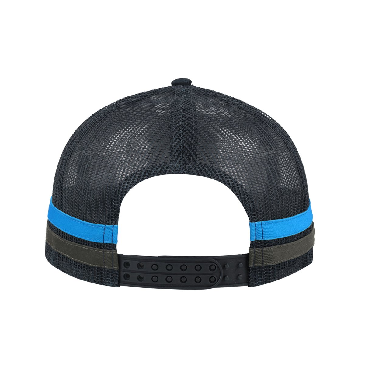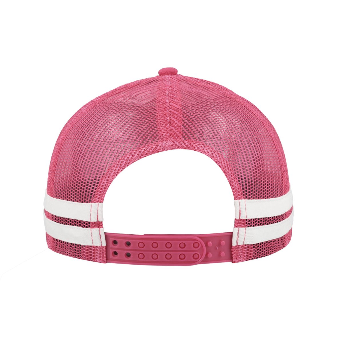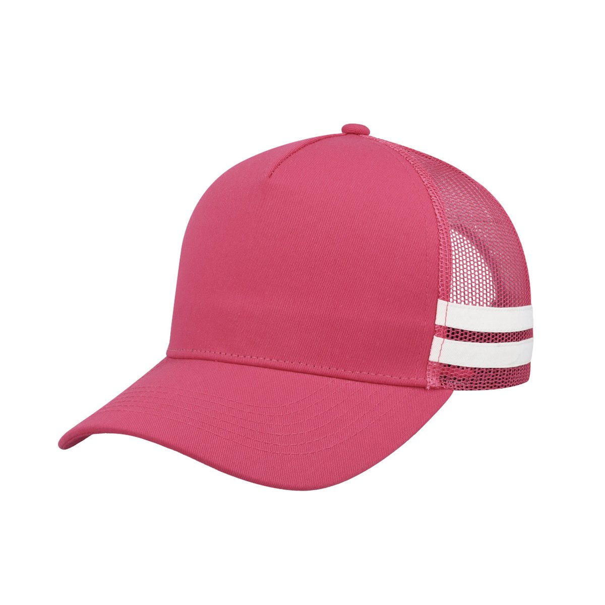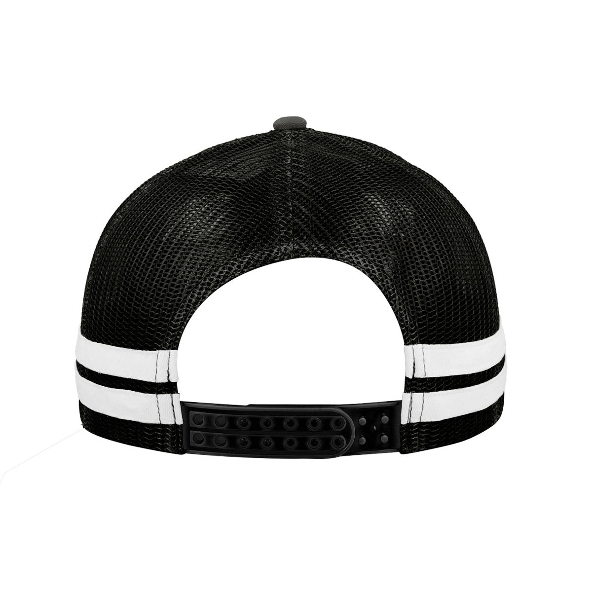 • This cap features a classic five-panel design with a striped front panel and a breathable mesh back.