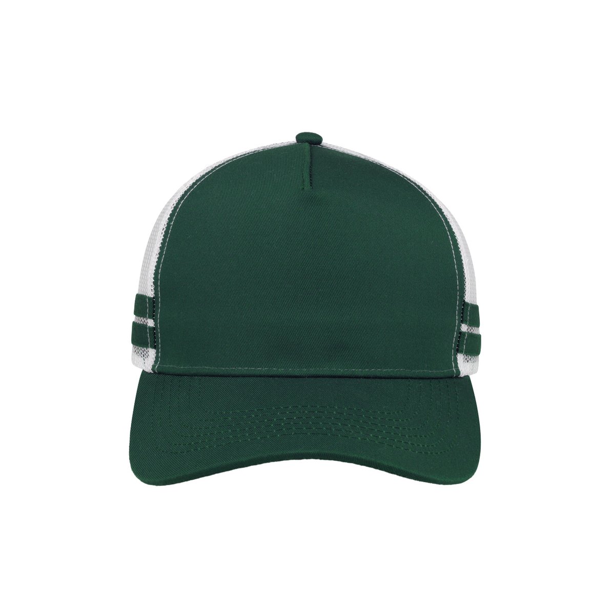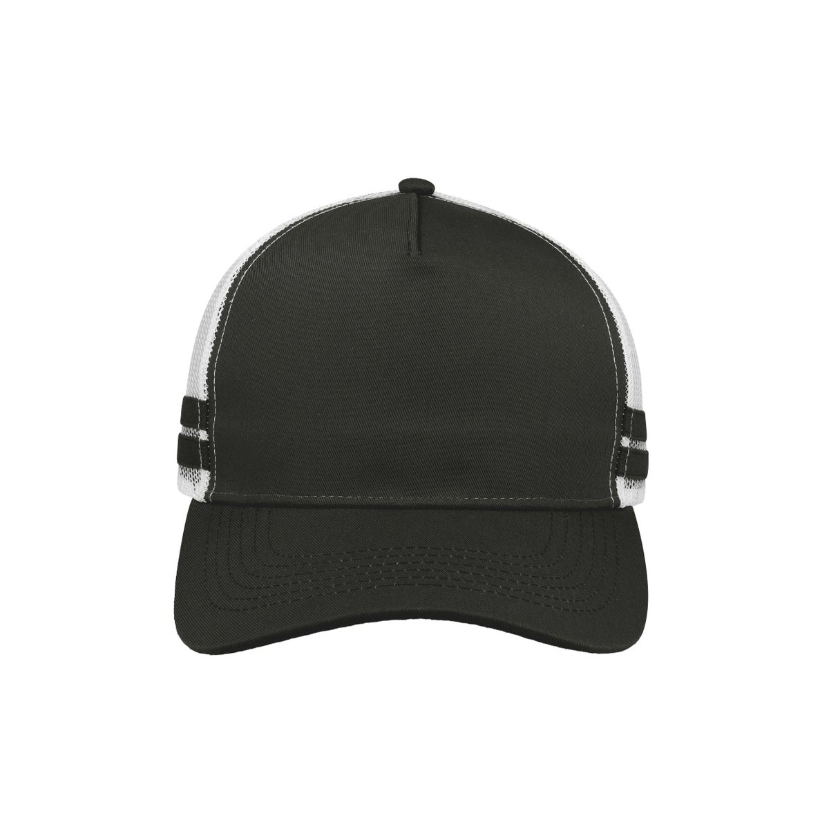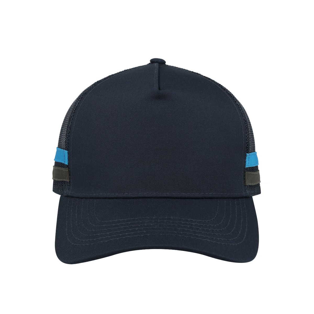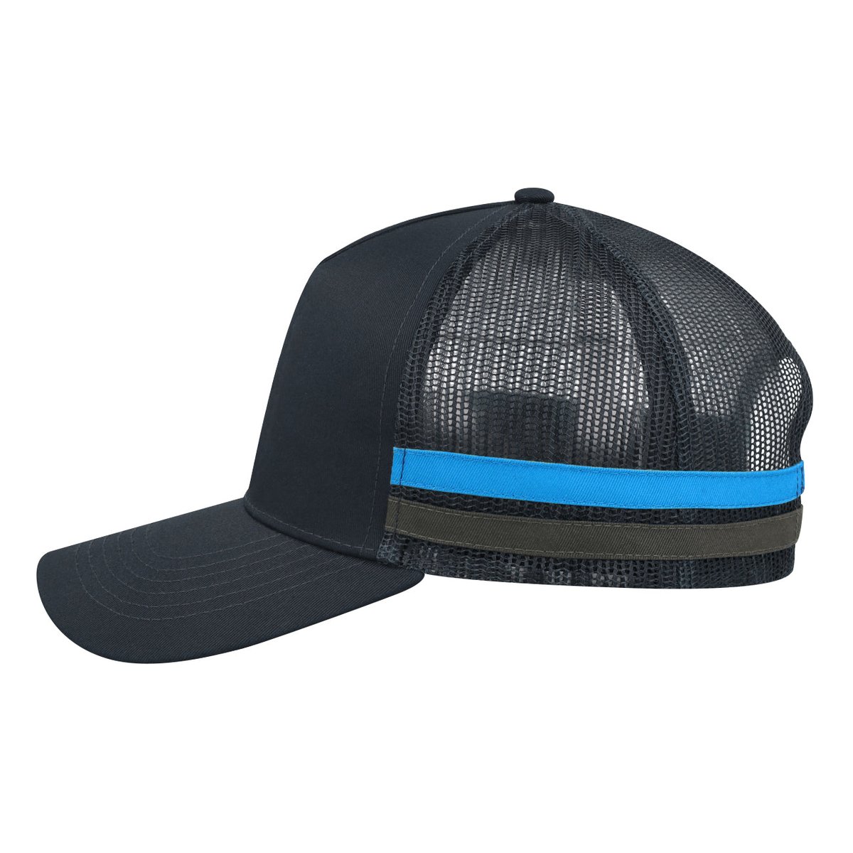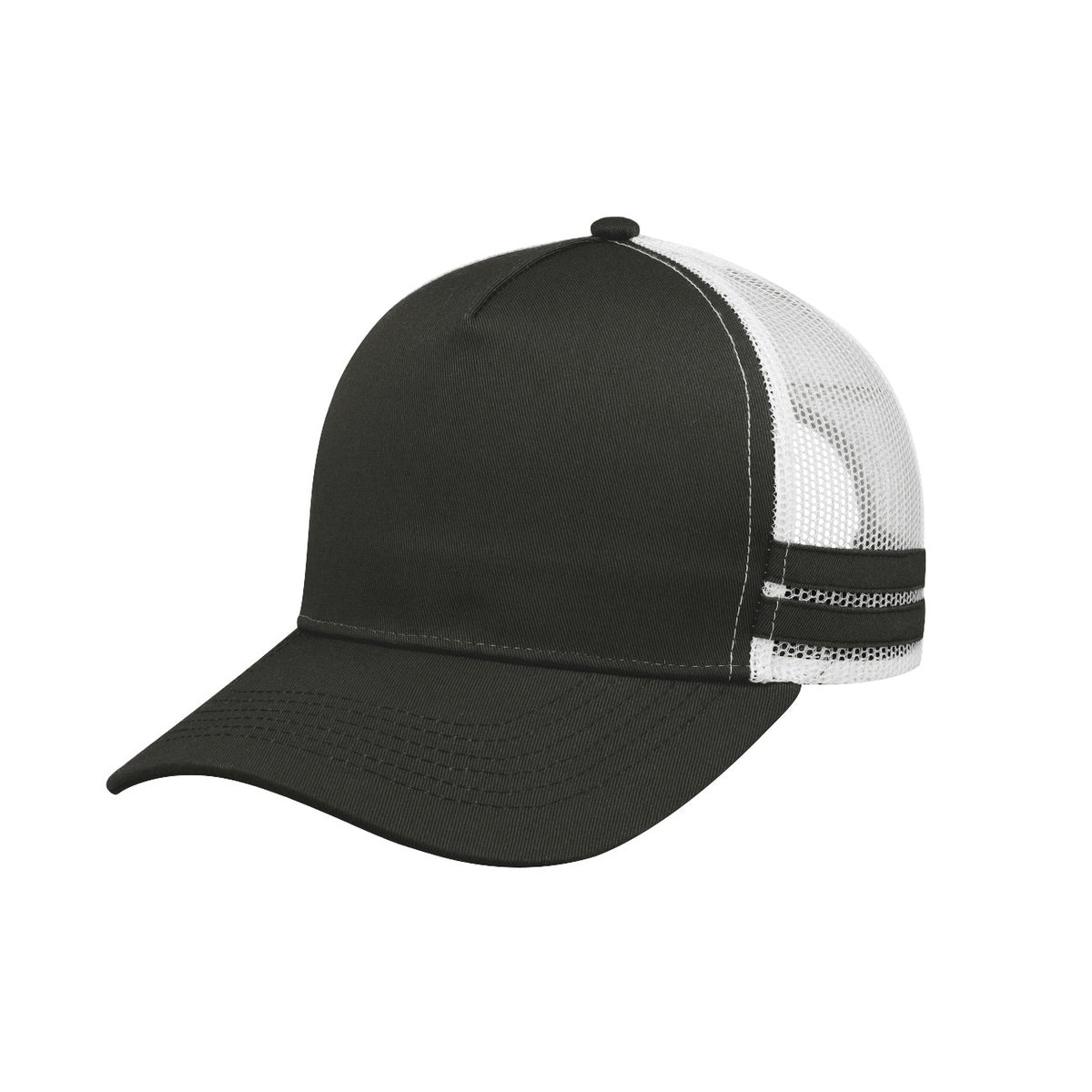 • This cap features a classic five-panel design with a striped front panel and a breathable mesh back.