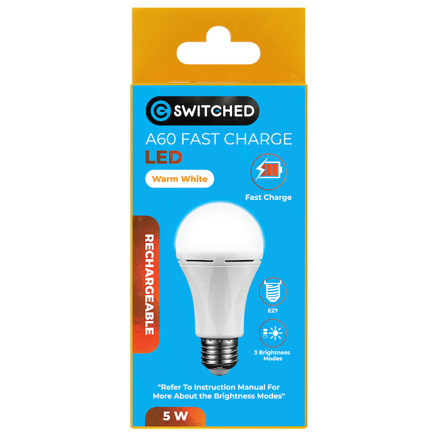 Get reliable light during power cuts with the Switched 5w A60 Rechargeable Fast Charge E27 LED bulb. It charges quickly in 3-4 hours and provides up to 7.5 hours of cool white light. This makes the Switched bulb a practical addition.