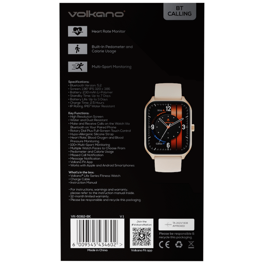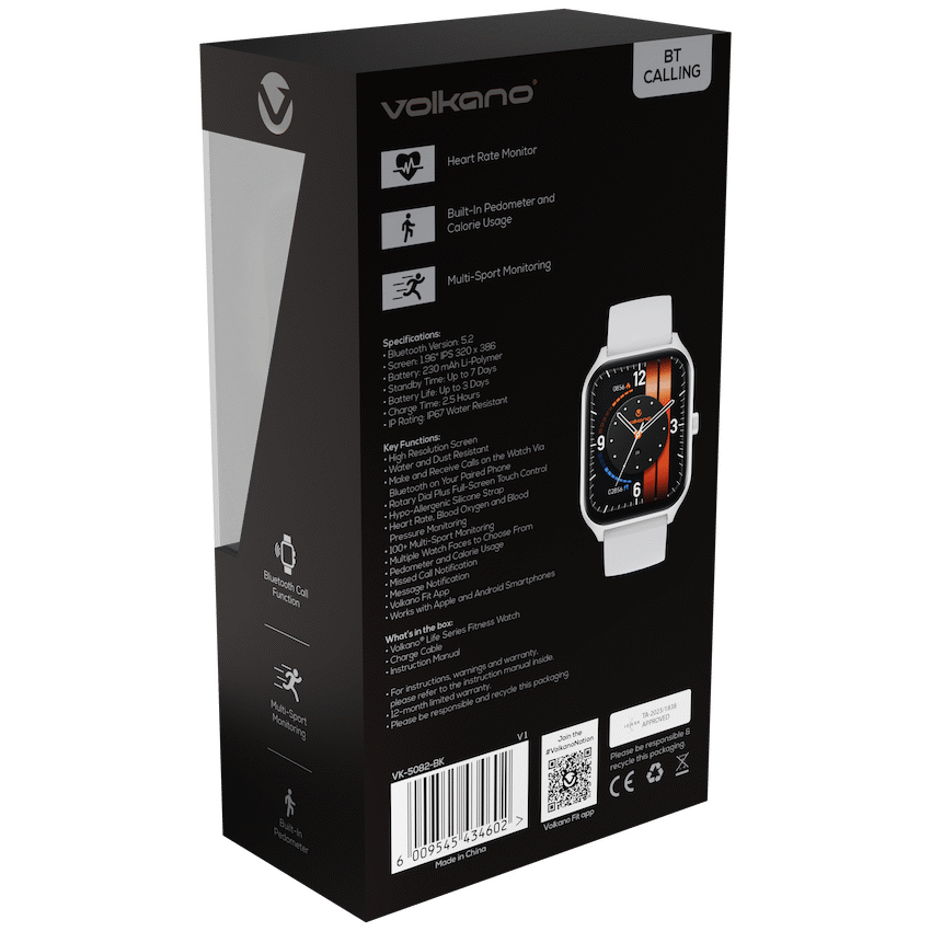 Stay connected and track your health simply with the Volkano Life Series Smart Watch. Make and receive calls directly from your wrist. It monitors heart rate and blood oxygen, with IP67 water and dust resistance, making it a practical Volkano device for daily use.