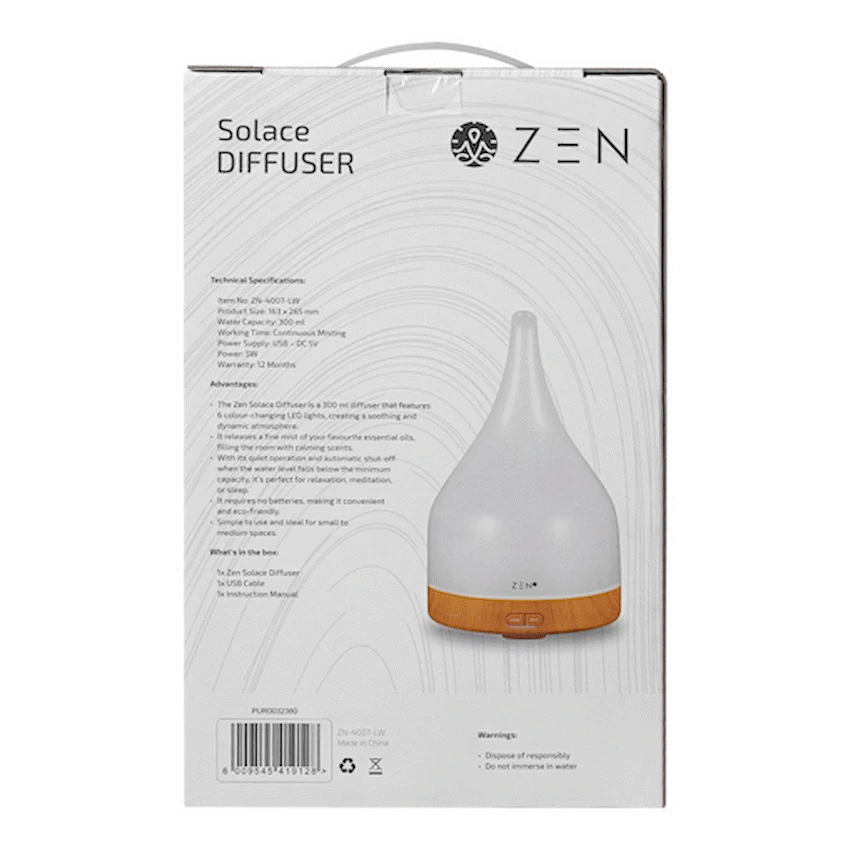 The Zen Solace Diffuser helps create a peaceful, calm atmosphere for relaxation and stress relief. It works with all Zen Oils for easy scent choice and has a sleek, modern design. This diffuser supports well-being in any space.